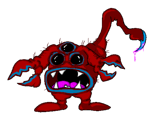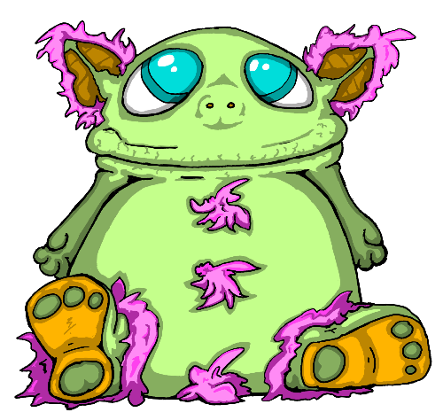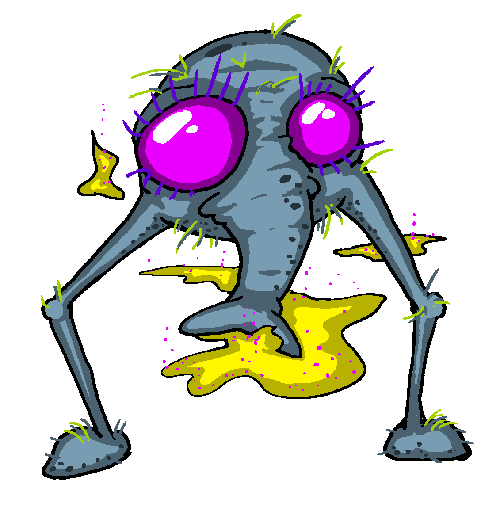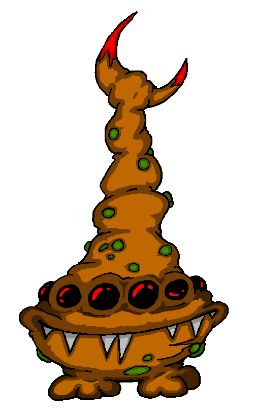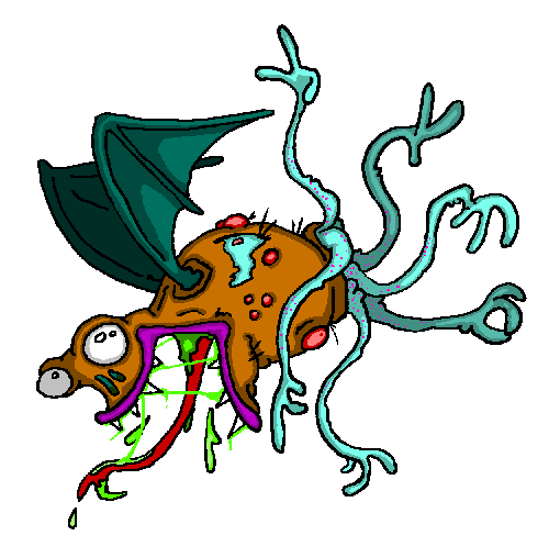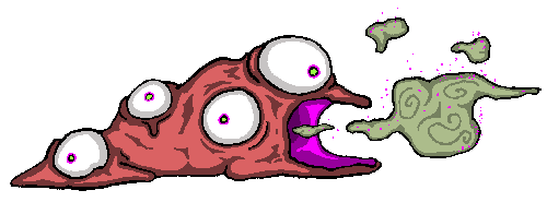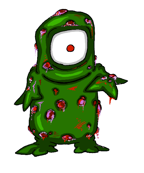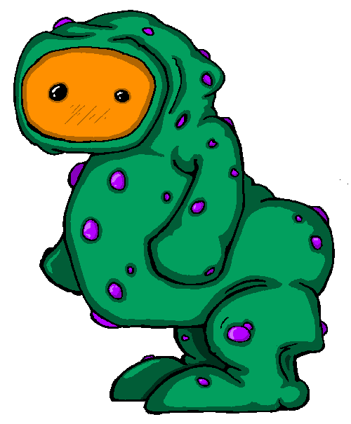 "Demidorf lives to spread the virus that gives it the characteristic green skin and seeping sores. It doesn't need to chase you down to do it, either. It simply wanders through your environment, sniffling and snorting and clearing its throat, and being as rude as you can imagine about its obvious malady. It wipes its mucous with its hands. It touches every doorknob. It sneezes and coughs with its mouth open, while operating the water cooler, then shuffles through your crowded office and brushes against everyone it passes. It always takes the elevator. And whatever you do, just don't go into the bathroom after one of these. Feeling tired? Congested? Got a stuffled nose? Turning off all the lights in your house and curling up in the corner, a wall of tissues building up around you? You've contracted demidorosis, and if you've broken out in sores it's too late. Soon your skin will swell and turn dark green, and you will slowly lose all of the characteristic features of your species. The only ones you need to do your duty as a demidorf are a few stubby limbs, one large eye, and a mouth to cough with. The more your physiognomy differed from this end result, the more arduous and painful your metamorphosis will be. Then all you can do is spread demidorosis as widely as possible before you eventually shrivel up and expire.