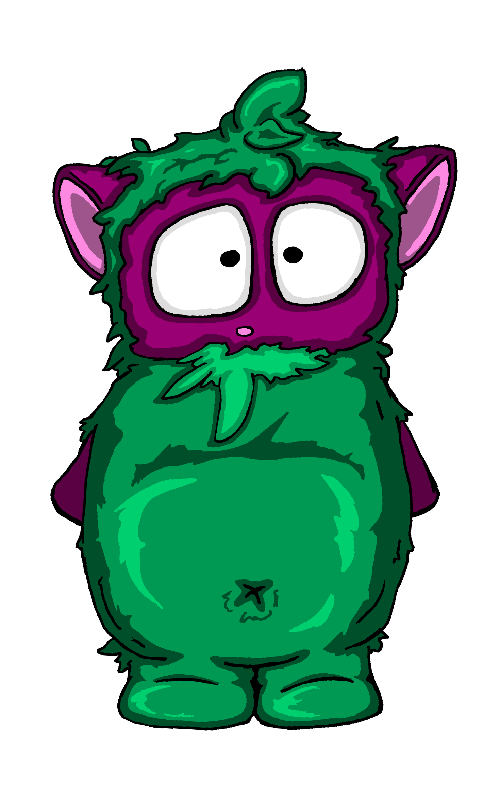 Eggbear hatchlings begin their lives as fuzzy green balls with eyes. Their purple face, ears, and hands emerge as they develop. They grow very rapidly, reaching two or three feet tall in just a week. When their growth has peaked, so has their flavor, and the hunt is on for creatures in the know. Eggbears aren't hard to hunt, either. They flee into the bushes to hide, close their eyes tightly, and hope they won't be spotted.