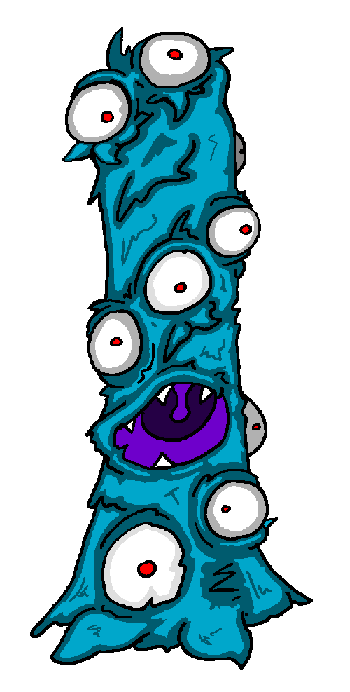 Towering among the trunks of trees and tree-like things, the largest optolith on record had 50 eyes, 13 mouths, and stood a full 100 feet tall. The common optolith, however, rarely grows beyond 20 feet. Its flagrant blue color clashes with the typical shades of foliage, drawing the attention of curious critters that might wander right into one of its many mouths.