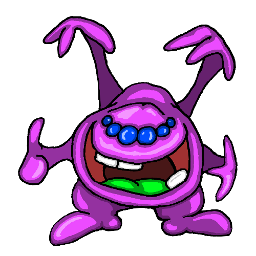 As far as we know, we've only seen one of these. We've found no way to propagate it, either, though we've managed to get a hold of bits of its substance. Jlime is more or less amorphous, and gloops about in whatever direction it pleases. And it is quite pleased, as far as we can tell. With a gleam of delight in its one huge eye, it sloshes toward objects or creatures it has taken interest in and gives them a big ol' lick. Anything licked this way becomes sour in flavor, no matter what it would have tasted like before. Jlime can become attached to some creatures and get a bit clingy, forming noodley tentacles to hold onto its friends. It won't mind if you lick it back, either, although it has an unbearably sour flavor - likely the main reason it hasn't been eaten yet. As goopy as it looks, jlime is jelly-like and essentially frictionless; contact with it leaves no residue behind. If something gets a hold of its long gummy tongue, the only reasonably grabbable part of its body, it can drop the organ and grow itself a new one.