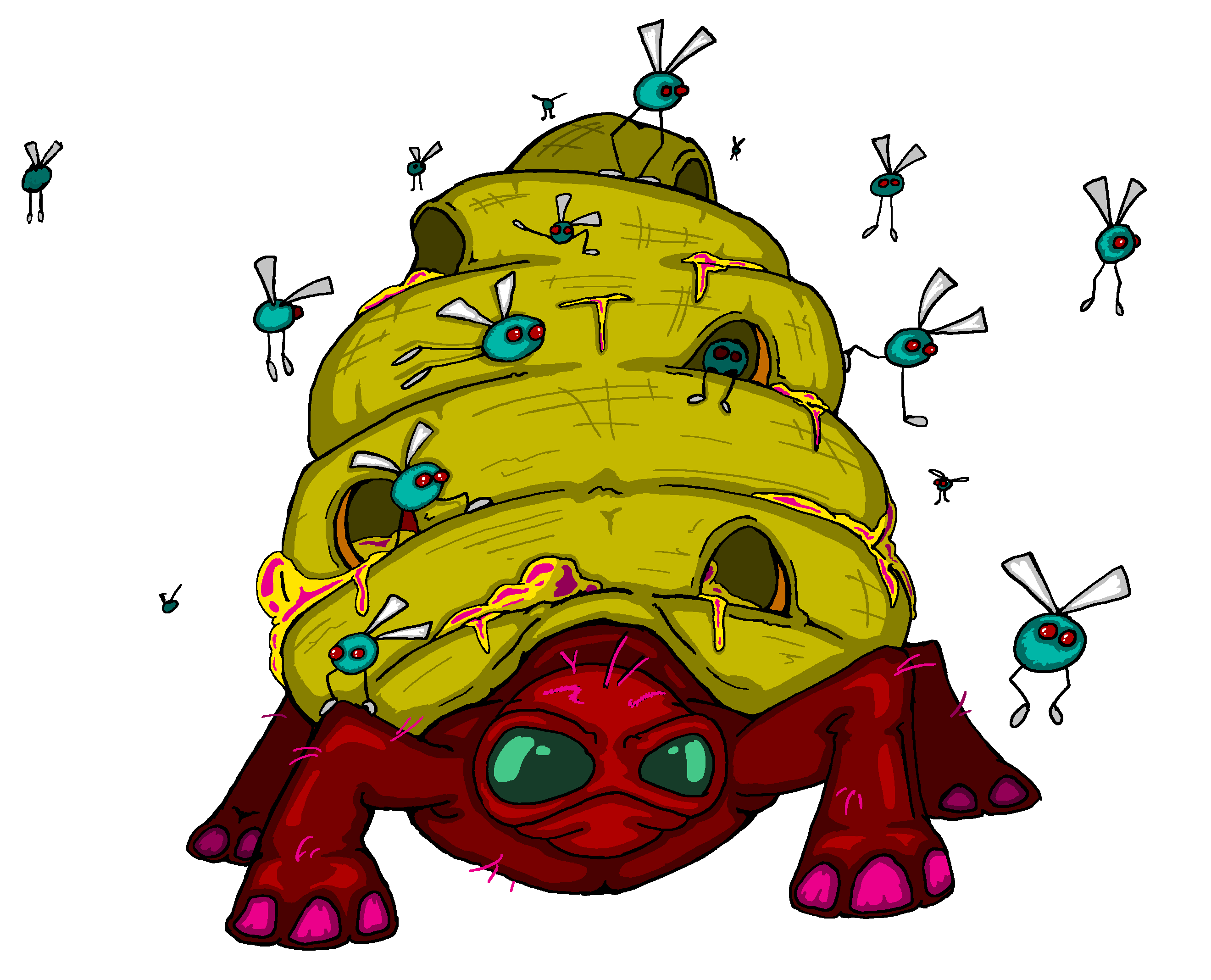 It's hard to explain the distortle. At first glance, a red-carapaced creature appears to carry a yellow hive. It meanders aimlessly through its environment. Tiny flying critters enter and exit the hive at all hours. A thick, pinkish-yellowish substance oozes from within.